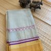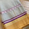 The body typically showcases subtle checks or stripes that highlight the saree’s handcrafted charm.