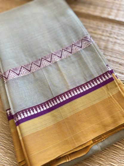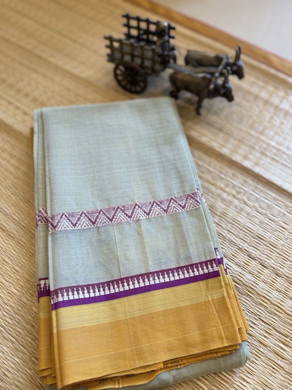 Features contrasting borders and pallu, often adorned with temple motifs or fine zari detailing.