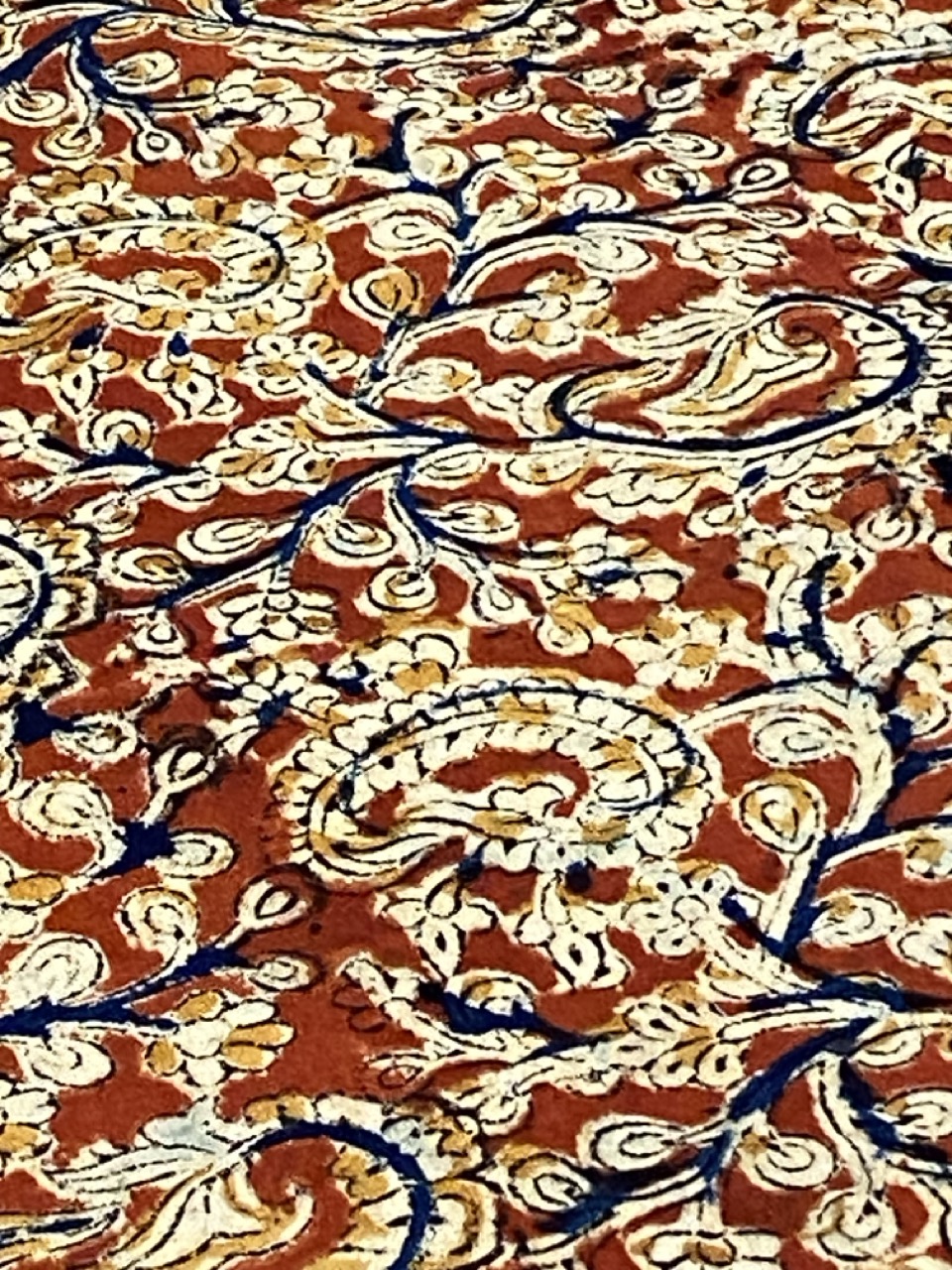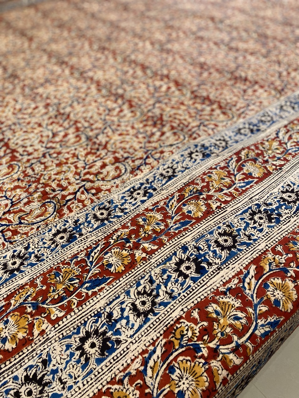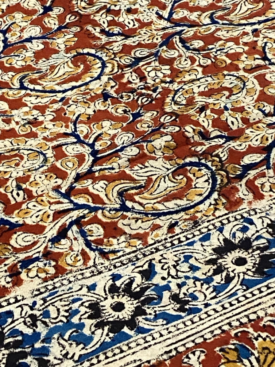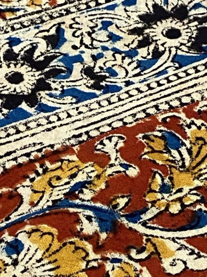 - Hand block-printed Kalamkari design in vibrant red, blue, and earthy tones.