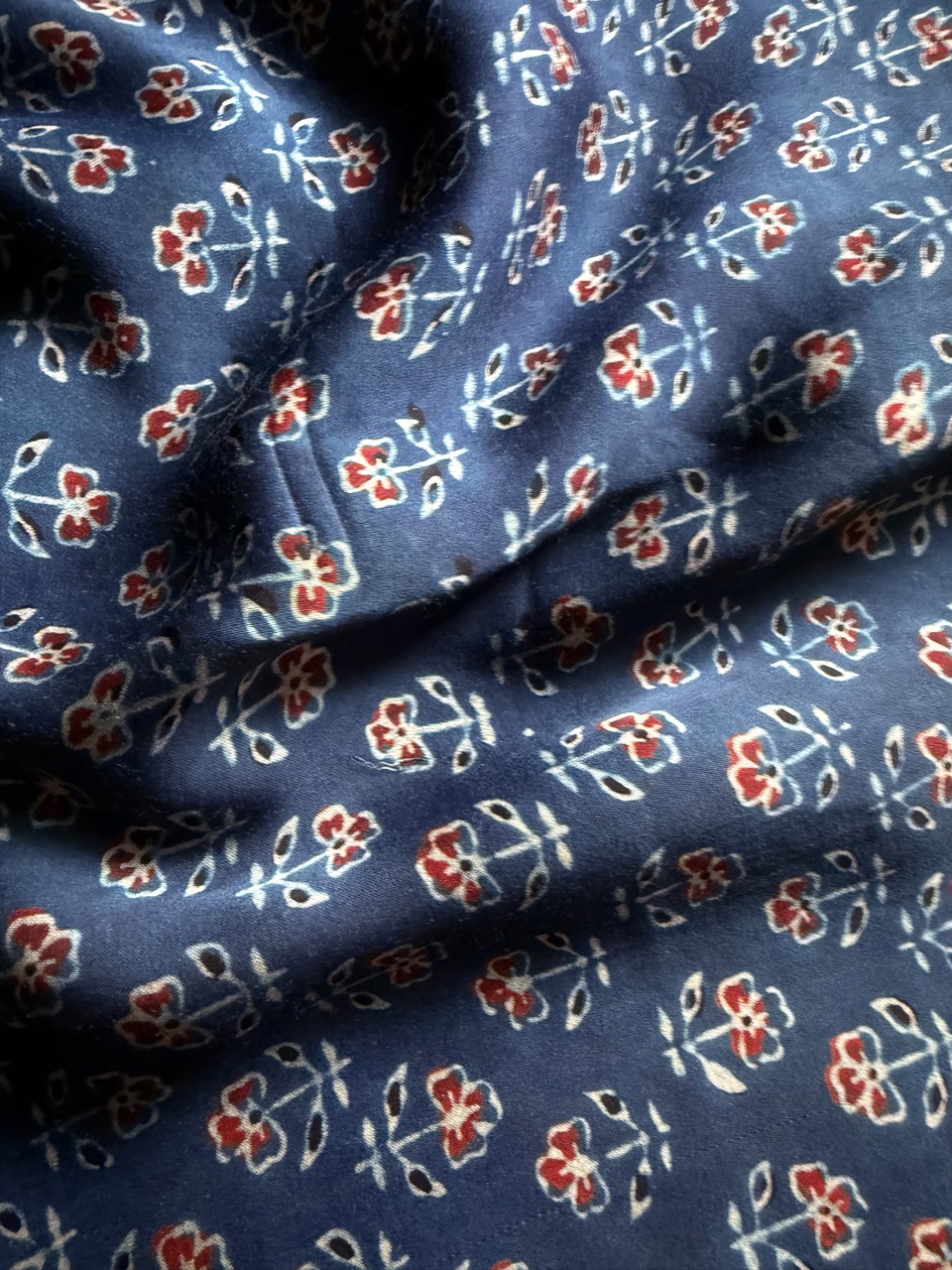 Each piece is handblock printed using the intricate Ajrakh technique, a heritage craft known for its detailed geometric and floral patterns. Dyed with natural, eco-friendly colors, this fabric carries an earthy charm while being gentle on the skin.