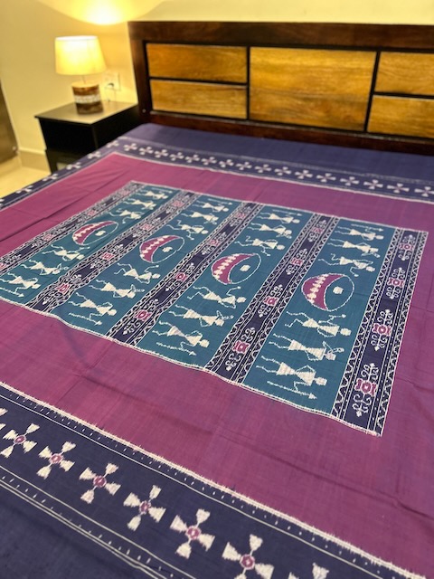 Sambalpuri Ikkat Double Handwoven Bedspread – Blue, Violet and Green Warli design