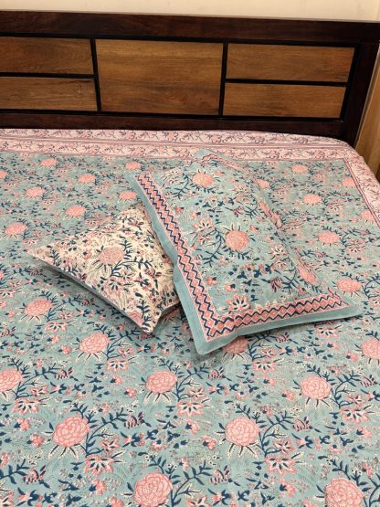 Sanganeri Handblock Printed Cotton King Size Bedsheet – Blue Garden