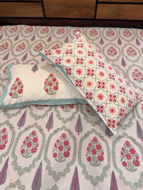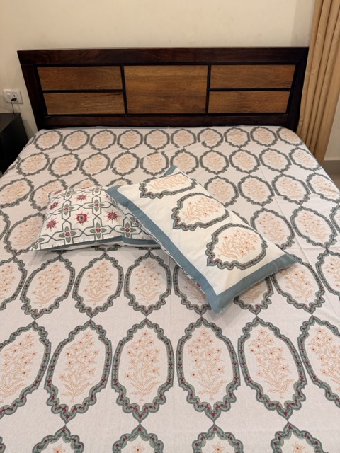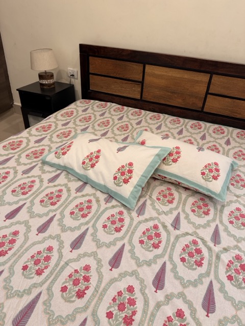 This handblock printed cotton bedsheet features classic Sanganeri prints, known for their fine floral patterns and delicate detailing. Printed by hand using carved wooden blocks, each bedsheet carries subtle variations that reflect the beauty of a handcrafted process. Made from breathable cotton, it is comfortable, durable, and ideal for everyday use.