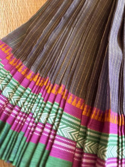 The body typically showcases subtle checks or stripes that highlight the saree’s handcrafted charm.
